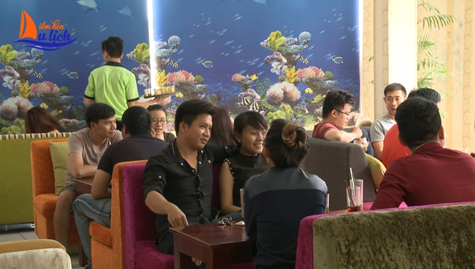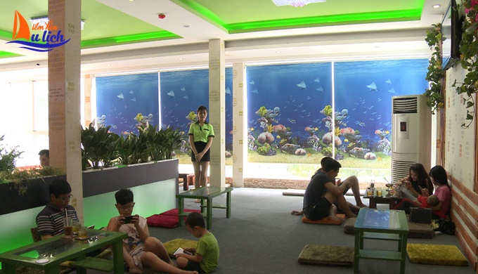 Tầng 1 là khu vực cà phê phòng lạnh và cà phê bệt, mỗi không gian đều được Mr Ket trang trí khác nhau để tạo cảm giác mới lạ: khu phòng lạnh với những tấm màn cách điệu, khi buông xuống bạn sẽ có cảm giác như đang ở trong thủy cung sống động dưới đại dương xanh thẳm.