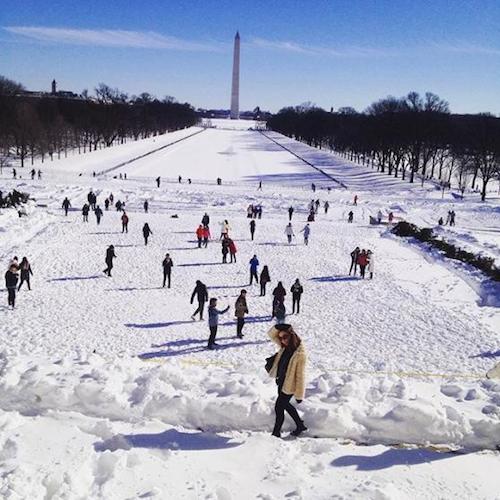 Tuyết ngừng rơi, người dân Washington đổ ra Đài tưởng niệm Lincoln và Quảng trường trung tâm để chụp ảnh và sưởi ấm. Ảnh: Au Pair.