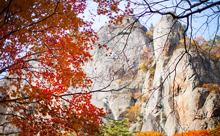Núi Seoraksan, tỉnh Gangwon: Nằm ở phía Đông Seoul, cách thủ đô Hàn Quốc 2,5 tiếng di chuyển bằng ôtô. Núi Seoraksan là một trong những nơi đầu tiên ở nước này chứng kiến lá đổi màu khi sang thu. Du khách tới đây rất đông để ngắm cảnh vào dịp cuối tuần. Nếu có dự định đến Seoraksan, bạn nên lên kế hoạch trước tránh gặp cảnh tắc đường khi lên núi. Ảnh: Visitkorea.