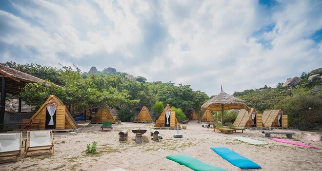 Các lều được đặt bên bờ biển để tận hưởng khung cảnh khoáng đạt hoặc dưới tán cây râm mát. Thiết kế đơn giản nhưng rất chất này giúp du khách có thể hòa mình với thiên nhiên và tận hưởng không gian trong lành với tiếng chim, tiếng sóng. Ảnh: Saobiencamranh