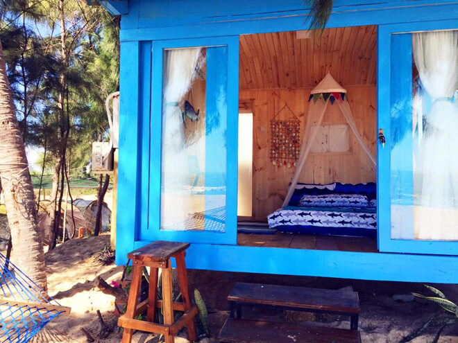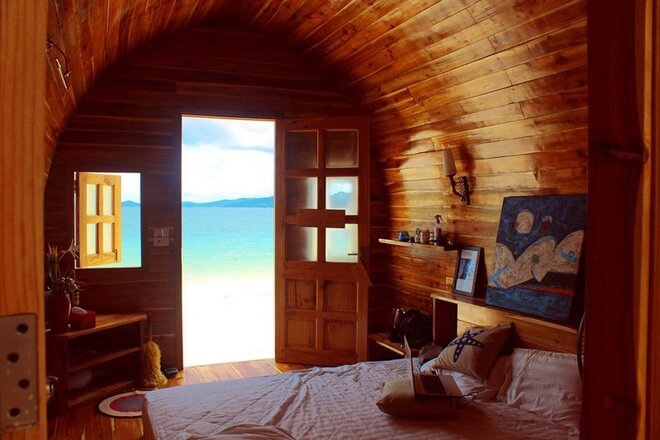 Chỉ cần mở cánh cửa là du khách có thể thu vào tầm mắt làn nước biển trong xanh nổi tiếng của Cô Tô với cát trắng mịn màng. Giá phòng một đêm tại đây là 500.000 đồng cho hai người. Khu nghỉ này nằm cách trung tâm thị trấn Cô Tô khoảng 6 km. Ảnh: Coto Eco Lodge