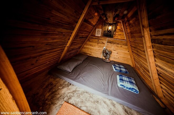 Lều được làm bằng gỗ, bên trong có nệm vừa đủ cho 2 người ngủ, gối, chăn, đèn, quạt bàn. Giá lều một đêm là 500.000 đồng. Tại đây, du khách có thể thuê thuyền tham quan các đảo lân cận, tổ chức tiệc nướng, đốt lửa trại. Ảnh: Saobiencamranh