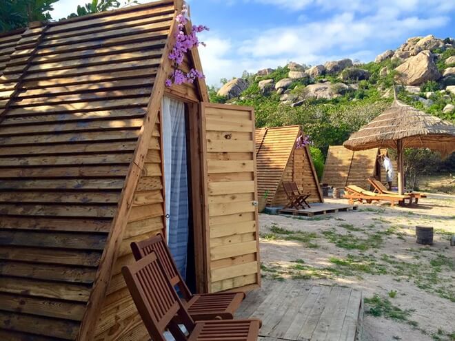 Căn lều được thiết kế với gỗ và kính cùng rèm che điệu đà, tạo cảm giác vừa lãng mạn, vừa hiện đại, rất riêng tư nhưng vẫn gần gũi thiên nhiên. Giá phòng một đêm từ 600.000 - 800.000 đồng. Ảnh: Coco Beachcamp