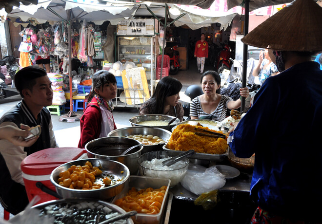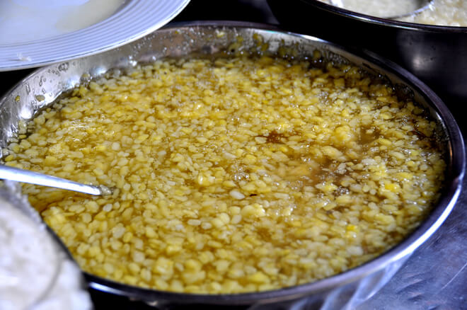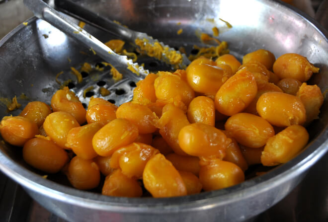 Chủ quán chè là người Việt Nam từng sinh sống ở Campuchia, năm 1970 gia đình về nước và mở quán với các loại chè nấu theo công thức từ xứ Angkor. Trong ảnh là món chè hạt mít, nguyên liệu chính là lòng đỏ trứng và đậu xanh nấu nhuyễn.