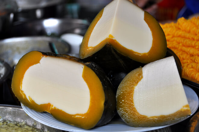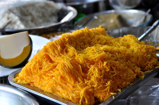Mì trứng không dùng bột là món chè được nhiều người ưa thích bởi vị béo thơm. Thành phần duy nhất của món ăn là lòng đỏ trứng kéo thành sợi như sợi mì. Mì trứng ăn kèm nước cốt dừa tươi và nước đường.