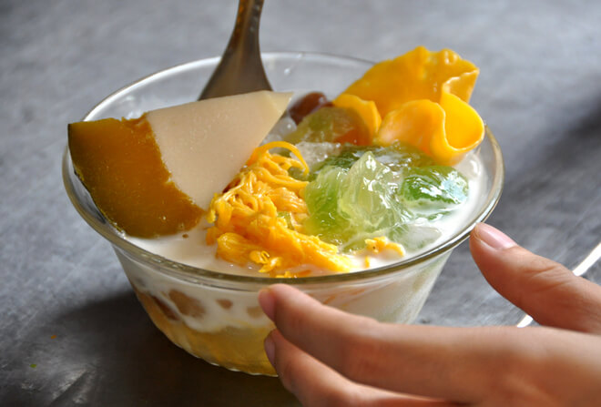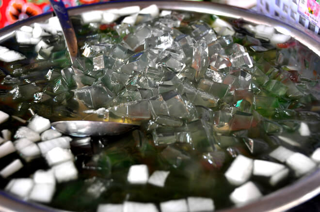 Rau câu dừa ăn với bánh lọt và nước cốt sầu riêng. Món ăn mát lạnh khi dùng chung với đá đập nhuyễn.