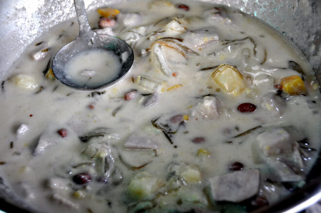 Chè thưng nấu theo công thức Campuchia thơm ngọt bao gồm nhiều loại đậu, khoai, nấm và dừa.