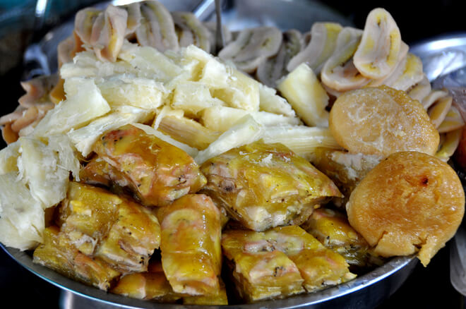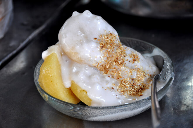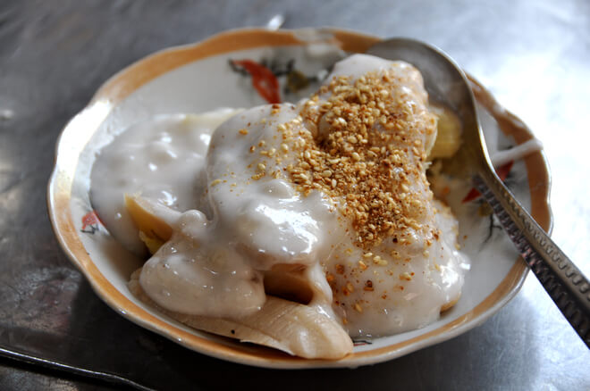 Chuối được chín xắc lát mỏng hoặc cắt nhỏ hòa với bột năng hấp chín. Ngoài ra quán còn có món khoai mì (sắn) hấp. Tất cả đều ăn cùng nước cốt dừa béo ngậy.