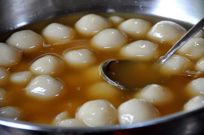 Chè trôi nước Campuchia viên không quá to nên không ngán. Nhân làm bằng đậu xanh. Nước nấu bằng đường thốt nốt cho vị ngọt thanh tao và hương thơm lạ.