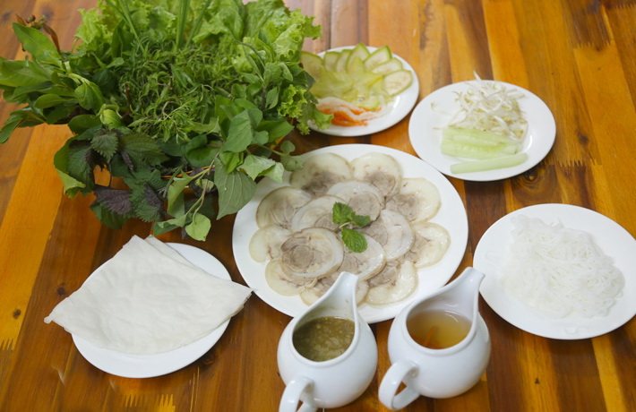 Bánh tráng phơi sương cuốn rau rừng, thịt luộc