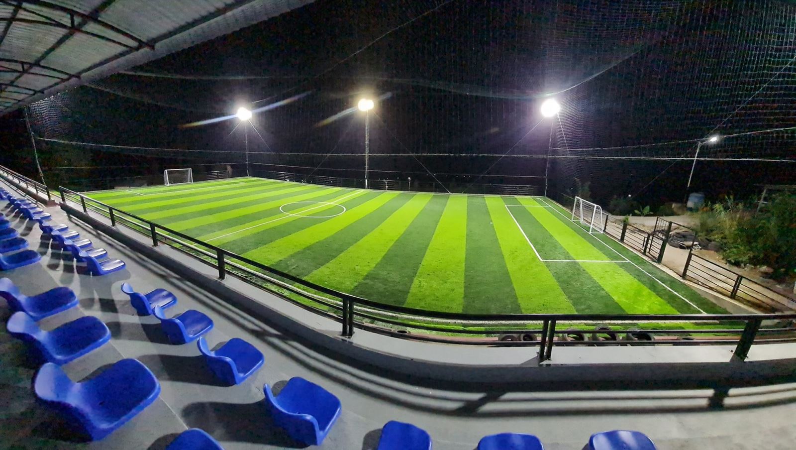 Do nằm ở sườn núi dốc nên để thực hiện sân bóng, chủ đầu tư phải xây dựng hệ thống bờ kè có đáy rộng 2,5m, có vị trí kè cao tới 8m. Ngoài ra, do nằm ở độ cao gần 600m, bên dưới là vực, nên để đảm bảo an toàn, đơn vị xây dựng phải làm cột lưới cao 18m, giăng lưới nóc để đảm bảo bóng không bay ra ngoài, gây nguy hiểm cho người dân. Lưới và cột lưới, cột đèn đều được sử dụng nguyên vật liệu tốt nhằm đảm bảo độ chắc chắn, an toàn.