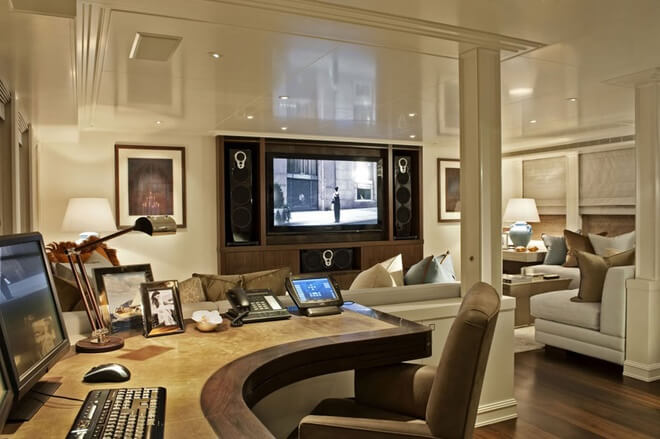 Trên thuyền cũng có bàn làm việc và khu xem phim thoải mái.