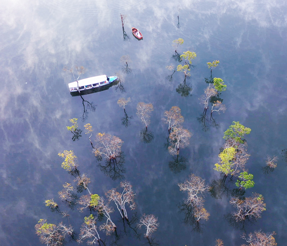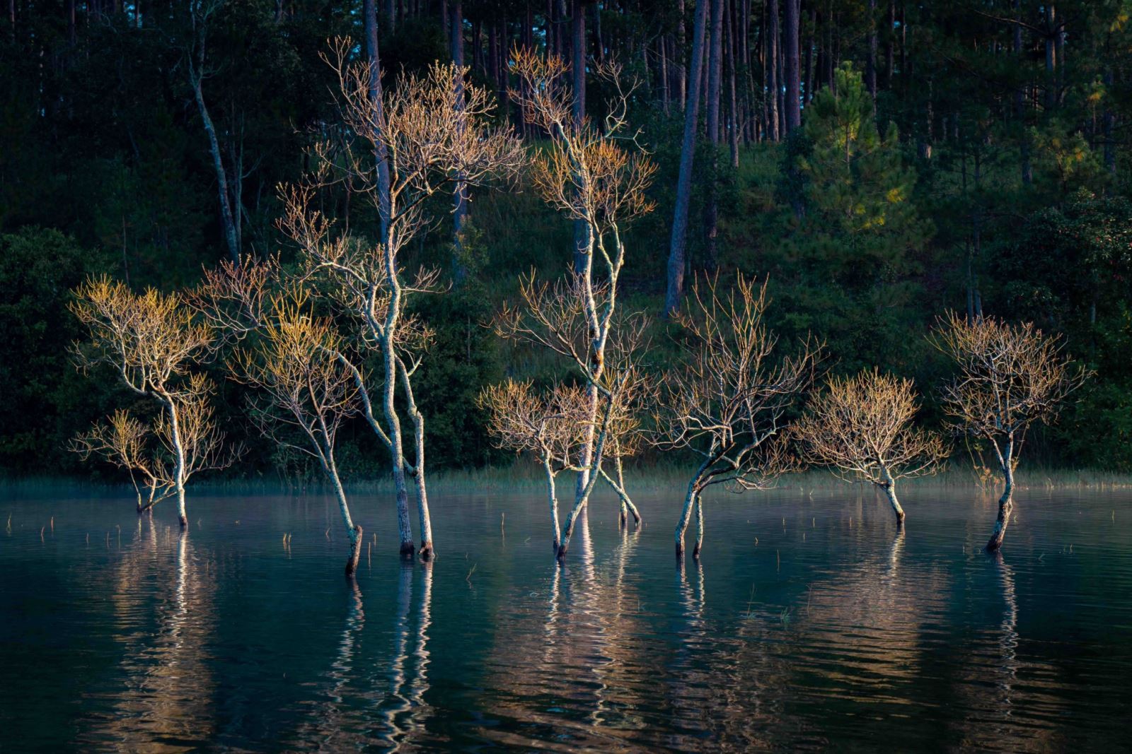 Bên cạnh vẻ đẹp vẹn nguyên như hồ ngọc giữa rừng thông thuở ban sơ, Suối Tía càng cuốn hút du khách hơn với rừng cây ngập nước trong làn sương sớm đầu ngày. Rừng chò ngập nước tại nhánh hồ này là điểm sáng tác "cực phẩm" của nhiều nhiếp ảnh gia.