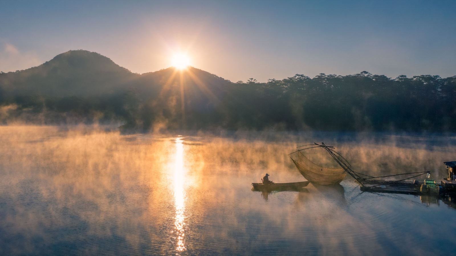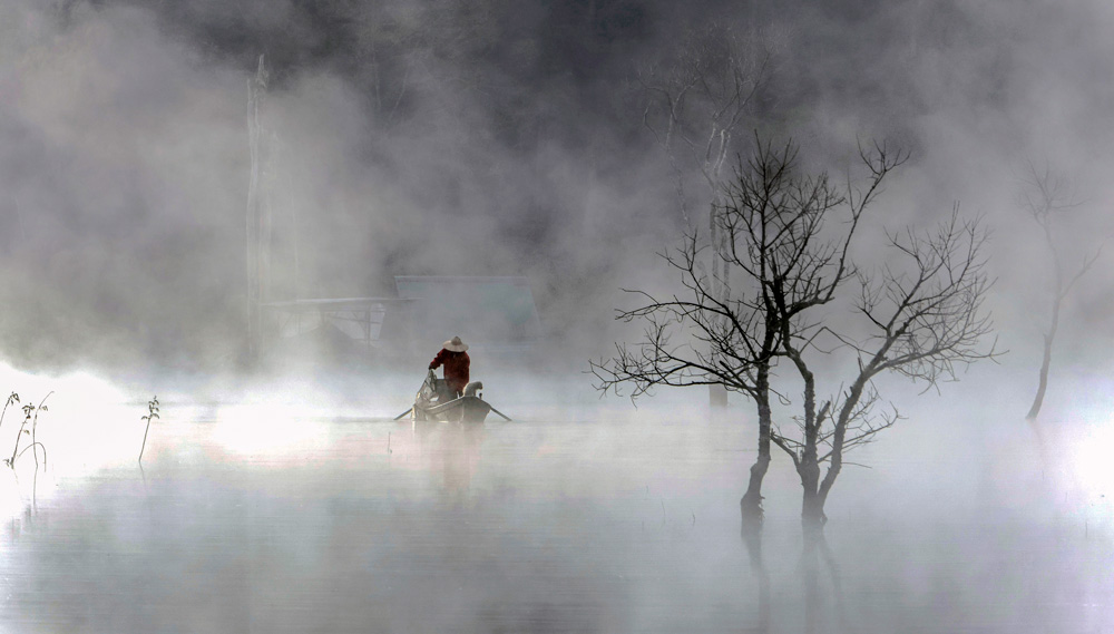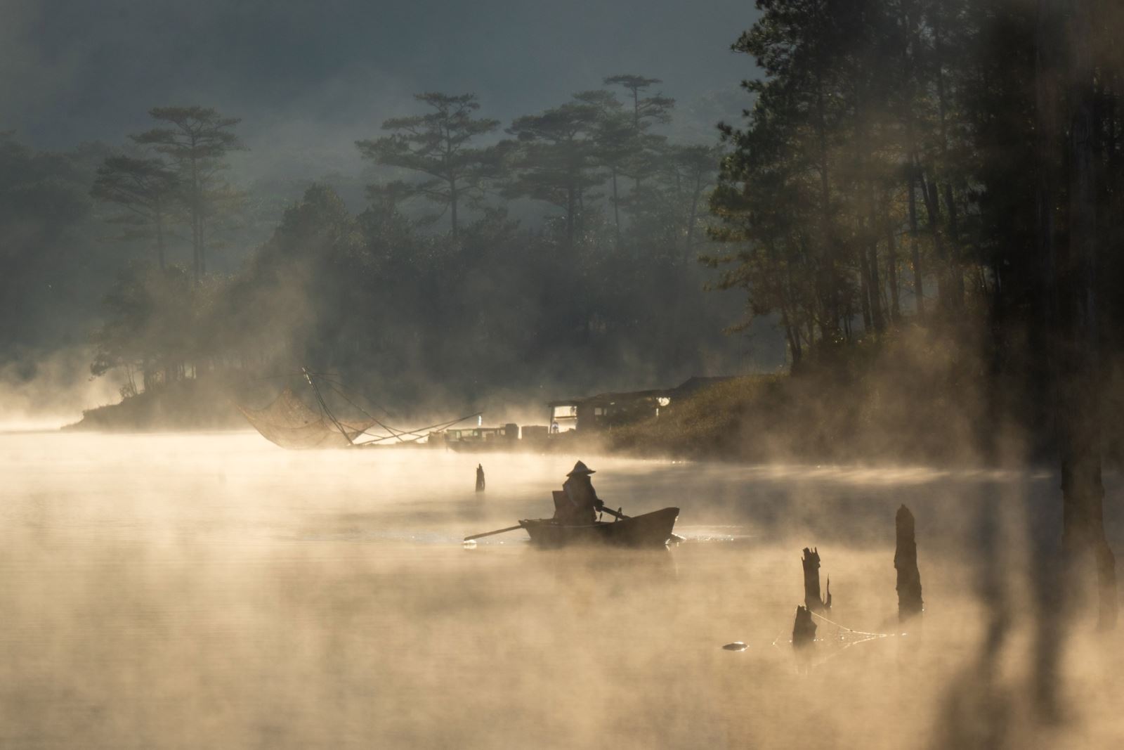 Chiếc thuyền mộc của lão ngư dân trôi trong làn sương càng làm cho không gian trở nên huyền ảo hơn.