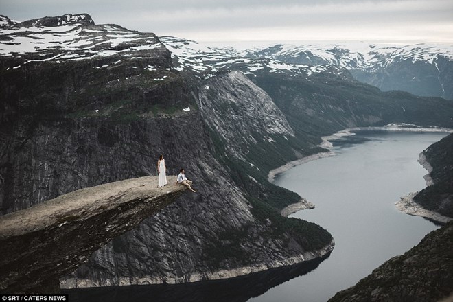 Như cặp đôi cuối cùng trên trái đất: Khung hình tráng lệ như trong sử thi này được chụp tại mũi Lưỡi Quỷ Trolltunga ở Na Uy. (Nguồn: Dailymail)