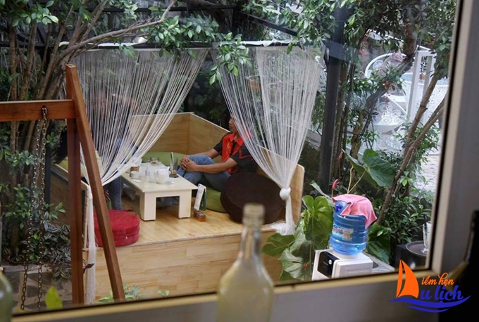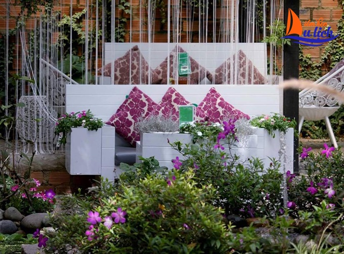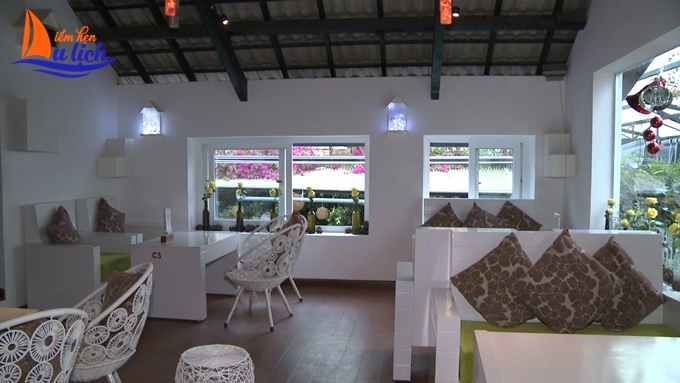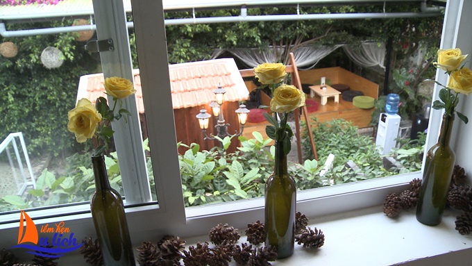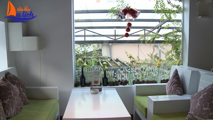 Toàn bộ quán là một màu xanh của cây điểm xuyết những bông hoa đặc trưng của Đà Lạt lãng mạn đầy chất thơ.