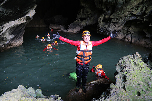 Một người chơi hứng thú sau khi hoàn thành phần bơi trong hang tối. Ảnh: Hoàng Táo