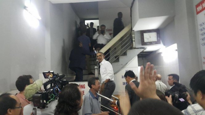 Bước vào quán ăn, ông Obama vui vẻ bắt tay, hỏi thăm chủ nhà hàng cùng các thực khách đang có mặt tại tầng 1.