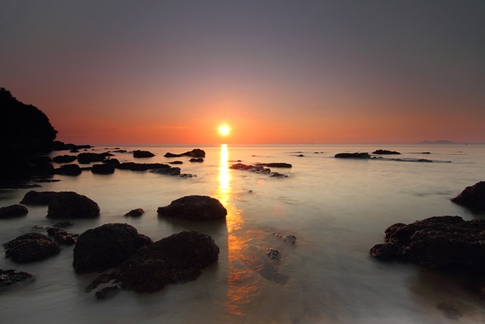 Biển, trời, sắc tím của rạn đá như mãi lưu giữ vẻ đẹp bí ẩn trong ngàn năm kiến tạo. Thi vị nhất là để đôi chân trần lang thang lướt nhẹ trên bãi cát mịn vàng êm ái tìm đến những mảng đá ghồ ghề được chồng lên nhau tạo nên những mảng lớn, núi đá lưng chừng mọc lên trên nền xanh phía Bắc của biển.