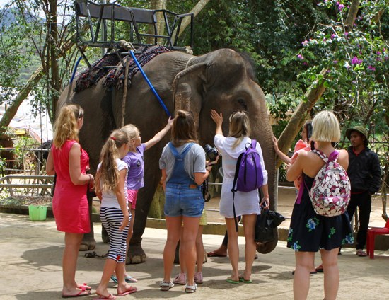 Du khách nước ngoài vuốt ve những chú voi thân thiện.