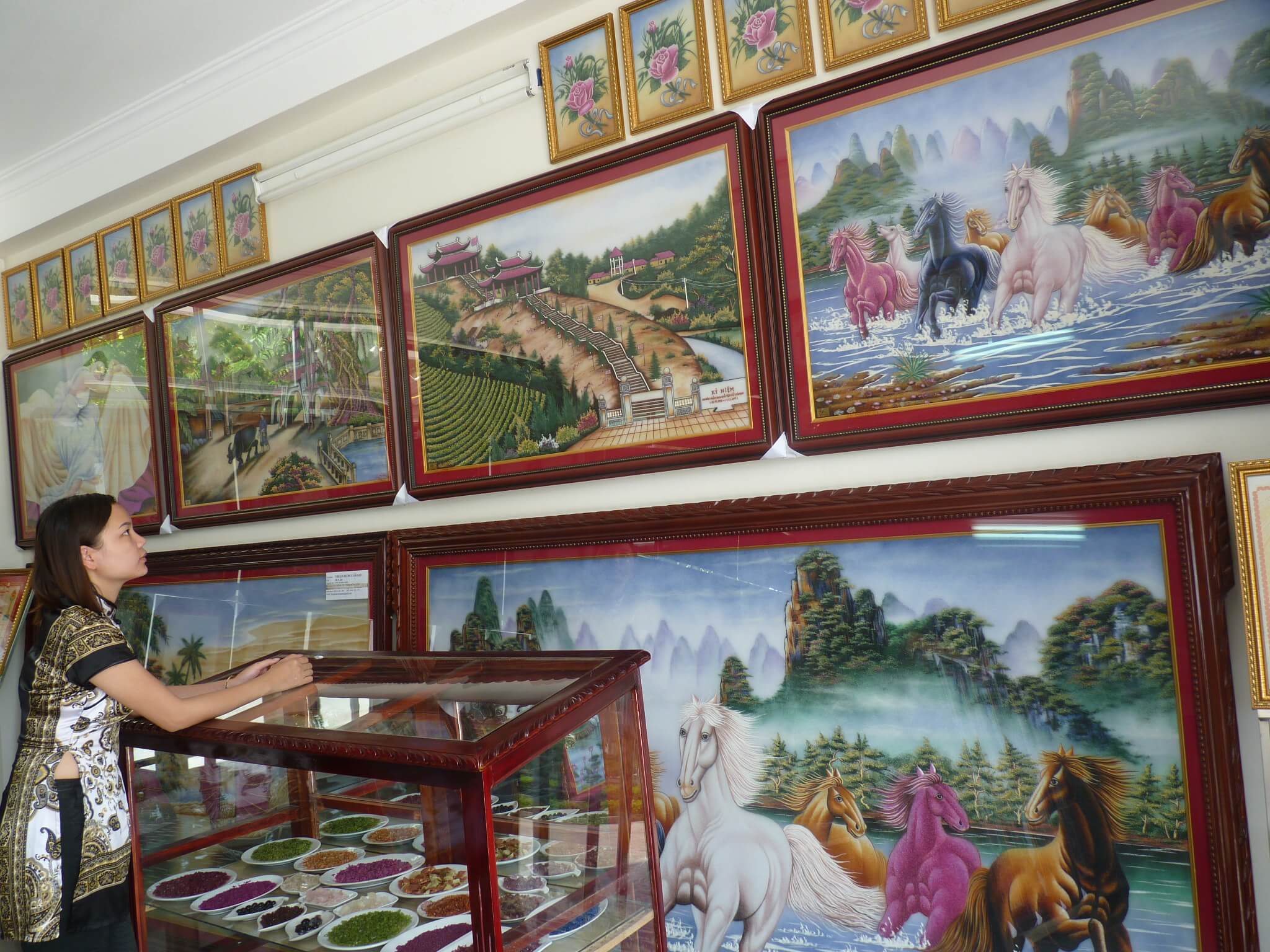 Tranh đá quý Dũng Tân có một đặc điểm rất khác so với nhiều tranh đá cùng loại của các cơ sở khác, đó là màu sắc của tranh không bao giờ thay đổi bởi nguyên liệu làm tranh là đá tự nhiên 100%. “Còn nếu có đá công nghiệp thì sau một thời gian, màu sẽ biến đổi theo chiều hướng nhạt dần” - Ông Dũng cho biết.
