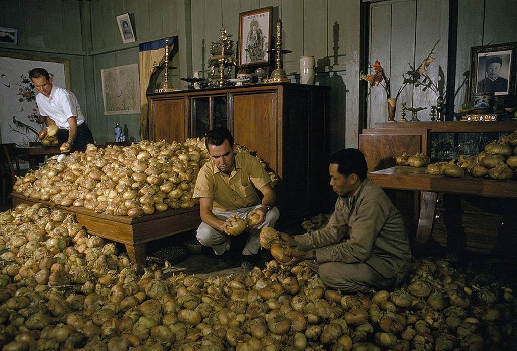 Hai người Mỹ đến kiểm tra và thu mua Hành Tây từ người nông dân Việt. Đà Lạt 1961