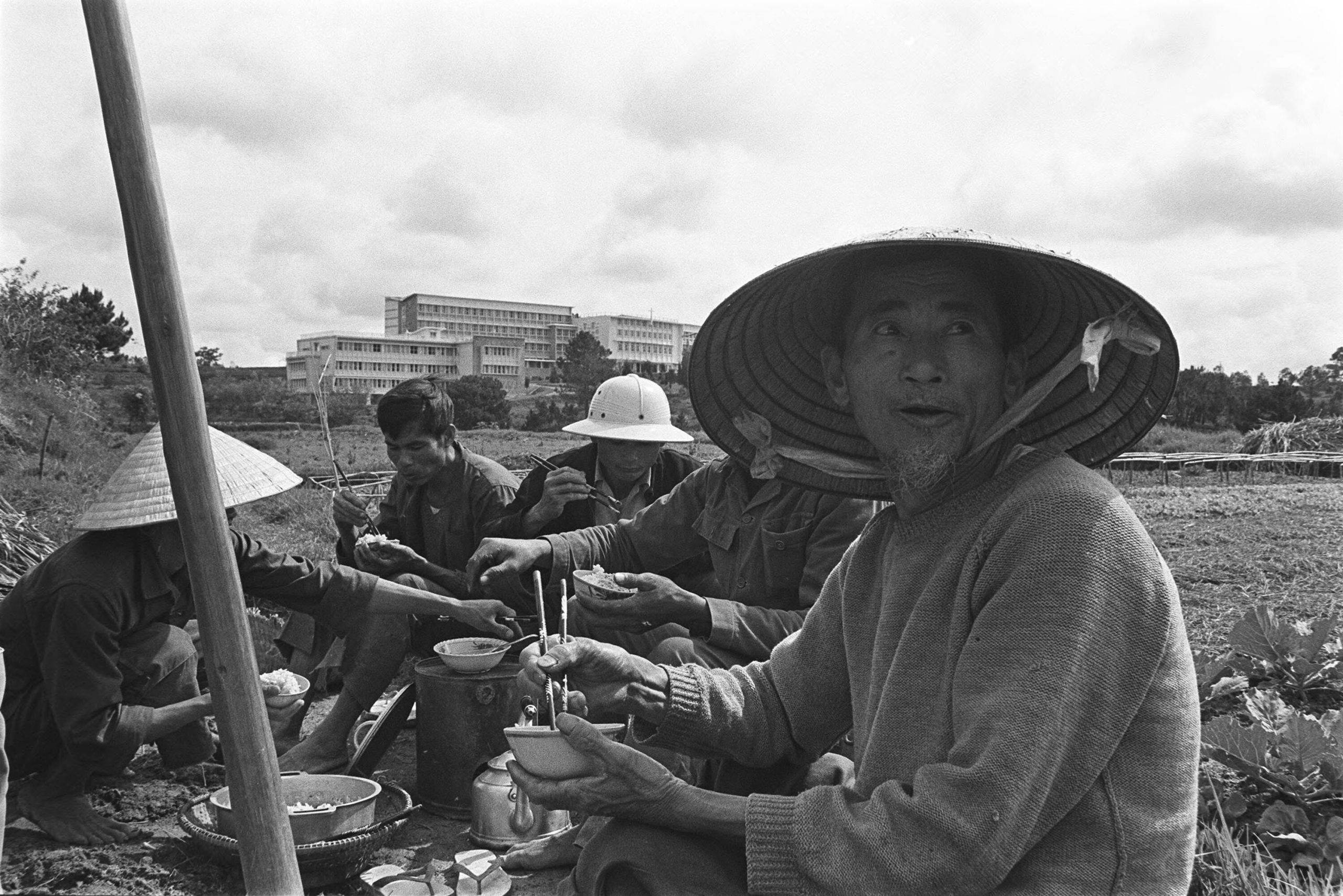 Những người nông dân đang ăn bữa trưa. Phía xa là Giáo Hoàng Học Viện Piô X. Đà Lạt 1967